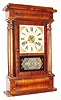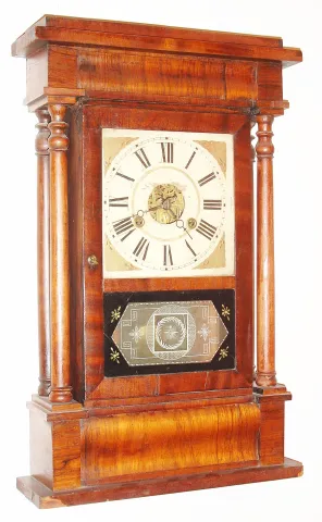 Sperry and Shaw, New York, 30 hour, time and strike, 4-column weight shelf clock, c1845 Refinished rosewood and mahogany veneered case in good condition with some veneer loss on the base, on the top and a poor repair on the door and . Original painted dial has age darkened a little with paint loss at the mounting pins and in the center area. Hands are original. Tablet is original. Blue label inside the case notes "Agents for Crane's Patented Year Clocks." Ht 25.5"