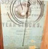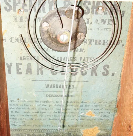 Refinished rosewood and mahogany veneered case in good condition with some veneer loss on the base, on the top and a poor repair on the door and . Original painted dial has age darkened a little with paint loss at the mounting pins and in the center area. Hands are original. Tablet is original. Blue label inside the case notes "Agents for Crane's Patented Year Clocks." Ht 25.5"