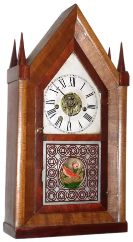 Unknown, 30 hour, fusee time/strike/alarm steeple clock, From the remains of the label it appears that this clock was retailed in New York City, probably by Henry Sperry, c1850 Refinished mahogany veneered case. It is our opinion that the lighter brown veneer on the case has been replaced. The base has some veneer chips. The original dial has been repainted. The bell inside the case is most likely a replacement. Tablet and hands are original. Ht 21"