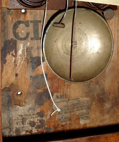 Unknown, 30 hour, fusee time/strike/alarm steeple clock, From the remains of the label it appears that this clock was retailed in New York City, probably by Henry Sperry, c1850
