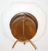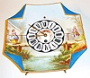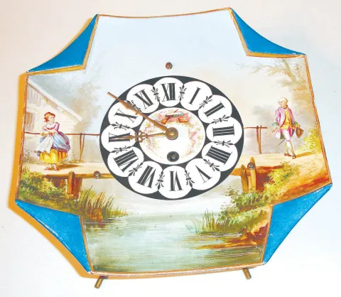 France or Germany, earthenware plate clock with easel back, square, gilt edge with folded corners, with a rural scene in polychrome over glaze enamels, featuring a man and a woman on opposite sides of a bridge, each dressed in 18th century style clothing, Roman numeral dial with brass hands, the dial center decorated with a small trophy featuring musical instruments 8 day, time only, pendulum movement with tic tac escapement, c1900 Very good overall, no damage to ceramic, some minor scrapes/ scratches to enamel, minute hand matches hour hand but is a bit long, movement running Ht 10"