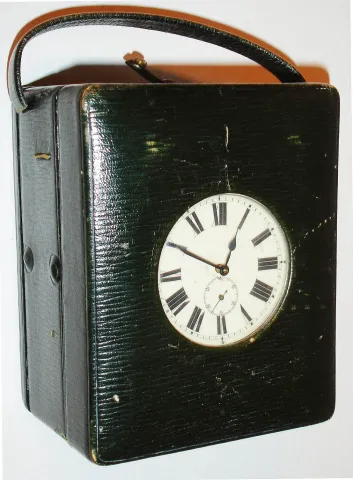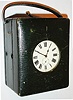 Movement running well, dial and hands very good, velvet lining very good, original battery holder with label, brass contacts will need work, leather covering on case good with scuffing, handle broken on one side Ht 5 3/8", W 4 1/4", L 3 1/4"