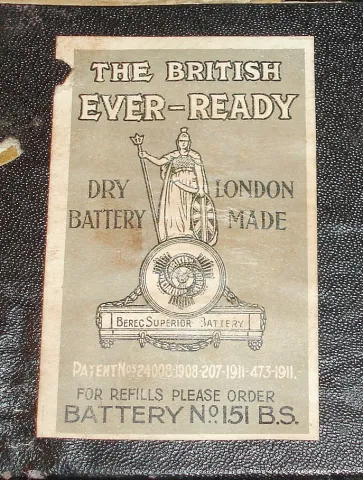 England?, leather bound travelling clock with Swiss thirty hour watch movement, pin pallet escapement, celluloid Roman numeral dial, backlit for viewing at night by depressing button on top of case, green velvet lining and key holder in front compartment, back compartment with battery holder, blued steel hands, c1910 Movement running well, dial and hands very good, velvet lining very good, original battery holder with label, brass contacts will need work, leather covering on case good with scuffing, handle broken on one side Ht 5 3/8", W 4 1/4", L 3 1/4"