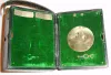 England?, leather bound travelling clock with Swiss thirty hour watch movement, pin pallet escapement, celluloid Roman numeral dial, backlit for viewing at night by depressing button on top of case, green velvet lining and key holder in front compartment,