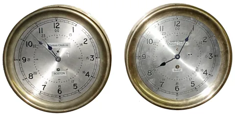 Clocks- 2 (Two) Chelsea 8 day brass 8" dial threaded bezel marine timepieces, 1943 and 1945