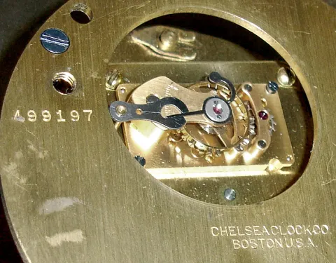 Clocks- 2 (Two) Chelsea 8 day brass 8" dial threaded bezel marine timepieces, 1943 and 1945 both cases have signed time-only jeweled movements, numbers 387302 and 499197, but both metal dials have newer white stickers with the company name and city. One cast case is heavy and has an old nice patina. The other case is lighter, with vent holes in the bottom, and is stamped "Made in Taiwan" on the back; and its glass is loose in the bezel. Overall diameters 10"