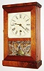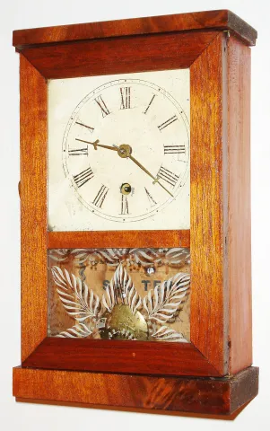 S. B. Terry, 30 hour, cottage timepiece with a ladder type movement, c1851. Refinished mahogany veneered case in clean condition. Original painted dial with loss at the mounting pins and at the winding arbor. Hands are original. Remains of an original tablet. Clean label inside case. Ht 10.5"
