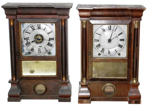 Clocks- 2 (Two) Seth Thomas Clock Co., Thomaston, Conn., "Column" rosewood veneer, 8 day, time and strike, shelf clocks, c1886