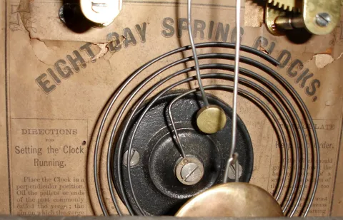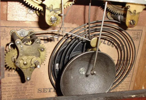 both restorable. Original dark surfaces with minor losses, mirror tablets, painted metal dials, and good inside labels. One with alarm has more seri...