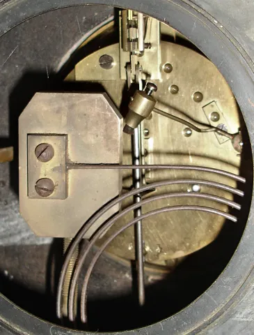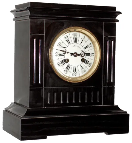 the heavy stone case retains its glossy black finish, and has two small corner chips up top and one tiny one on the lower front. The thick beveled glass is fine. The porcelain dial, made to look like the segmented ones on much earlier French clocks, has a small hairline and only part of the dealer name remaining. The movement is unsigned but has the A.1 stamp. Ht 12"