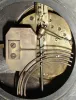 French, 8 day, time and strike, black slate mantel clock, retailed by Bigelow Kennard, Boston, c1900 the heavy stone case retains its glossy black finish, and has two small corner chips up top and one tiny one on the lower front. The thick beveled glass is fine. The porcelain dial, made to look like the segmented ones on much earlier French clocks, has a small hairline and only part of the dealer name remaining. The movement is unsigned but has the A.1 stamp. Ht 12"