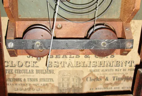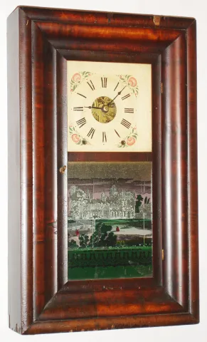 J.J. Beals, Boston, Mass., 8 day, time and strike detached fusee movement OG shelf clock. Movement was made by Birge and Fuller, c1846.