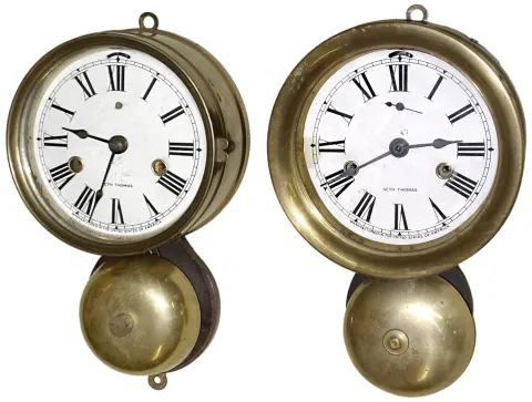 Clocks- 2 (Two) Seth Thomas brass 30 hour outside bell marine wall clocks, pressed metal bezel one c. 1890, cast bezel one c. 1925