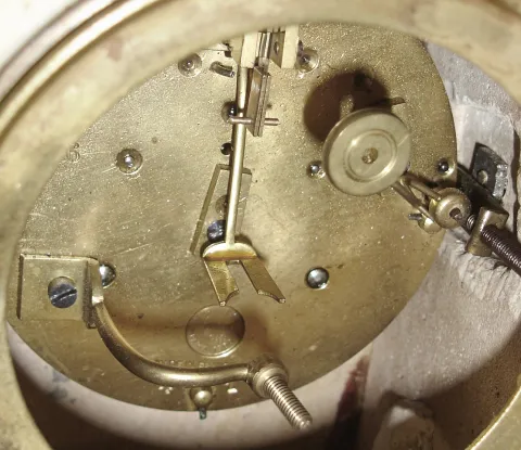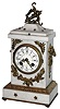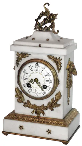 French white marble and bronze, 8 day, time and strike, mantel clock, c1905 this small, heavy and ornate case is in very good condition, but the fancy cast piece at the top is loose and needs to be secured. The porcelain dial, with its multicolor garlands, is fine; the convex glass has a bit of roughness at its edges. The movement, with rack and snail strike on a bell, is stamped S. Marti Medaille D'Or, Paris 1900". Ht 12"