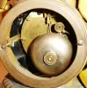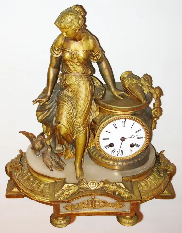 France, bright and matte gilt figural spelter and alabaster mantel clock, the female figure leaning against the clock case, and looking down at two birds, the base with acanthus, bellflower and fasces ornament, and an alabaster panel in the front with gilt ornament, white enamel Roman numeral dial with Breguet style hands, 8 day, time and strike, pendule a Paris movement, the case back signed "Ph. Mourey", c1870 Case dirty, with some loss to gilding, alabaster with one chip near woman's foot, dial with hairline at 8:00, hands abraded and with loss to blue, movement ticks and strikes Ht 16"