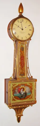 V.H.G. Wadlund, Broomall, 8 day, reproduction banjo or patent timepiece. Broomall is place in Pennsylvania and there is a Mr. Wadlund who lives in Broomall, so we assume he made this timepiece. The case is marked no. 15. c. 1959 Mahogany and gilt case in fairly nice condition. There is some loss to the gilding on various parts of the case. The protective film on the dial has turned yellow and has worn or lifted off in some places. Beautifully done tablets that were copied from an original was painted by a Rene Sharples. Mr. Wadlund used a Howard movement to power this timepiece. Ht 41"
