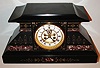 France, Belgian slate mantel clock with red and white marble moldings, gilt incised line and leaf decoration, white enamel Roman numeral dial with blued steel hands, gilt bezel with thick beveled glass, 8 day pendule a Paris time and strike movement signed Marti with Brocot open escapement, c1880 Case with streaky appearance, some minor flakes and chips, bezel and glass very good, dial with minor hairlines, hands with spots of rust, movement dirty, but ticks and strikes Ht 8 3/4" L 15 3/4"