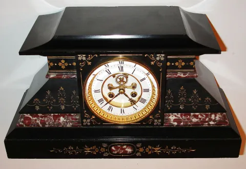 France, Belgian slate mantel clock with red and white marble moldings, gilt incised line and leaf decoration, white enamel Roman numeral dial with blued steel hands, gilt bezel with thick beveled glass, 8 day pendule a Paris time and strike movement