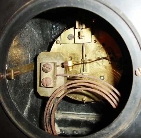 Case with streaky appearance, some minor flakes and chips, bezel and glass very good, dial with minor hairlines, hands with spots of rust, movement dirty, but ticks and strikes Ht 8 3/4" L 15 3/4"