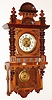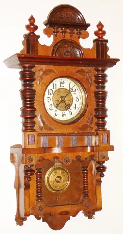 Carl Werner, Germany, walnut, 8 day, time and strike, wall clock, c1890 there is a nice old finish on this unusual ornate case, with just minor scuffs. The patterned dial center matches the pendulum bob, and the porcelain chapter ring is fine. The two top finials are replacements. The movement backplate has a "Werner's Original" trademark stamp. Ht