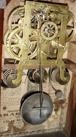 Chauncey Boardman, Bristol, Conn., mahogany triple fusee 30 hour steeple clock, c1850 this is the scarcest model with a fusee even for the alarm. There are only minor veneer losses and repairs, the top glass is wavy, and the lower multi-color tablet is very nice. The painted metal dial has flakes only near the screw holes. The inside label is complete but partially stained. Ht 20"