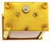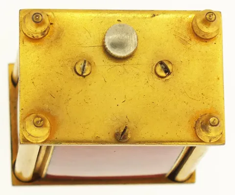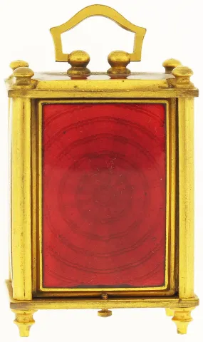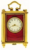 Switzerland, Lauret Watch Co. Inc, small travel clock with outer case, 7 jewels, stem wind and set nickel plate movement, with lever escapement in a gilt brass, red guilloche enamel case, and Arabic numeral, white painted metal dial in a green cloth covered travel case with brass catch, c1940 CASE: Very good overall, minor wear to gilding, enamel without cracks or chips. DIAL: Very good. HANDS: Sweep second hand missing. MOVEMENT PLATES: Minor scratches on plate. MOVEMENT FUNCTION: Running order (winds, sets and ticks). Travel case very good, Ht 2 1/2"