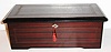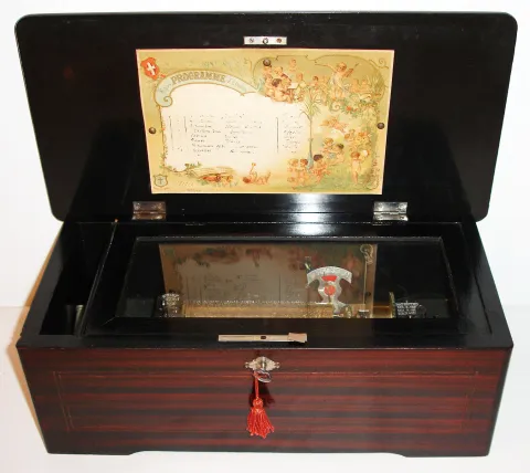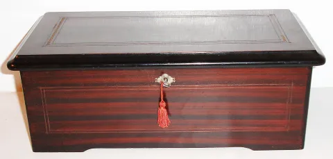 Box very good overall, appears to have had a floral stencil at the center of the lid at one time, now gone, a few pieces of the line inlay missing from the top, the box was clearly well cared for, a small very old loss to the top of the left side, not seen when the lid is closed, the inside with black lacquer, lithographed card in very good condition, movement clean and playing pleasant melodies crisply. L 15" W 7" H 5 3/4"