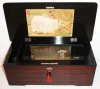 Switzerland, small eight tune cylinder music box, 5 inch cylinder with 35 tooth comb, glazed cover over movement, inside of lid with lithographed card in color featuring musical putti, and the tunes written in ink, the box with painted rosewood graining,