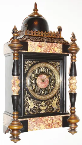 France, Belgian slate and multi colored marble mantel clock, the front with incised gilt and silvered ornament depicting two Phoenix eating snakes flanking a central urn, with trailing leaves, vines, and flowers, the front corners with turned slate and marble columns with gilt bronze finials and feet, the case top with Gothic inspired gilt bronze surround and slate dome, with bronze finial, black slate dial with incised gilt Arabic numerals, colored marble center, marked "W. H. Glenny and Sons and Co. Buffalo" with gilt hands, French, 8 day, time and strike, movement with square plates, c1885 Case very good overall, with some haze on sides and back, one small chip in colored marble, at back left, one chip in front of left column, repaired long ago, the gilt and silvered engraving bright and clean, bronze finials and feet polished to brass, now tarnished, dial very good, minute hand painted gold, movement clean, ticks and strikes, a very nice example. William H. Glenny (1818-1883), a native of Northern Ireland, established a crockery and import business in Buffalo in 1840. In the 1870's he took his sons into the expanded business as W. H. Glenny and Sons and Co. After his death in 1883 his sons ran the business until dissolved in 1898. Ht 19 1/2"