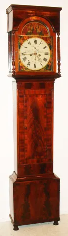 McLachlan, Glasgow, Scotland, tall clock, 8 day, time and bell strike, weight driven movement in a mahogany case with flat top hood and painted iron dial with portraits of women from the different domains of Great Britain surmounted by Queen Victoria in the arch, c1850 the case has a nice old finish with a repair to the top rear left and middle right of the hood. The upper rear left side of trunk was restored and the feet and bottom board are replacements. The dial is in good condition with the exception of one dial foot absent at upper left and a couple of small flakes. The movement has a replaced seat board and replaced risers and needs service. The pendulum is a replacement. Ht 82 1/2"