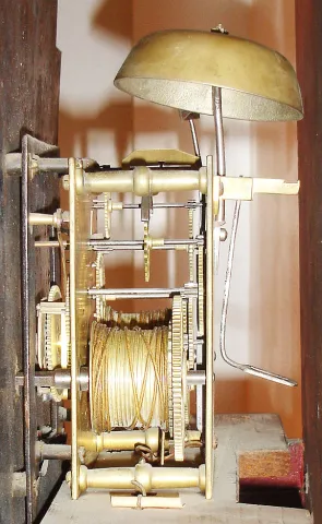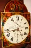 the case has a nice old finish with a repair to the top rear left and middle right of the hood. The upper rear left side of trunk was restored and the feet and bottom board are replacements. The dial is in good condition with the exception of one dial foot absent at upper left and a couple of small flakes. The movement has a replaced seat board and replaced risers and needs service. The pendulum is a replacement. Ht 82 1/2"