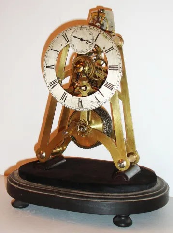 English fusee skeleton clock with platform escapement, polished A frame plates with 4 bold baluster form pillars, vertically mounted silvered platform with duplex escapement marked "Philcox 277 Patent", the brass balance with blued steel spring, silvered Roman numeral dial with seconds at 12:00, blued steel hands, mounted on a black painted velvet covered base, and covered by a conforming glass dome, c1850 Movement plates good, in old lacquer, with minor scratches, movement needs cleaning, balance broken from hub and reattached with solder, hairspring needs correction, dial with scratching and darkened in some areas, hands replaced, base probably replaced, dome dirty, cracked Ht 12 1/2"