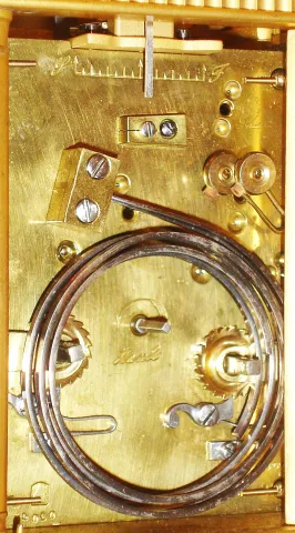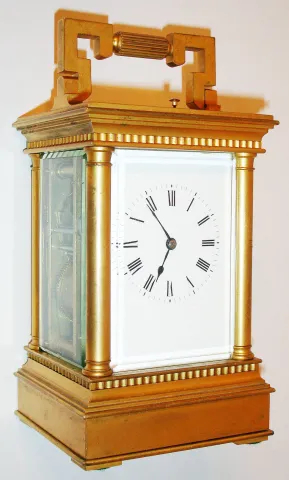 France, eight day petit sonnerie striking carriage clock with lever platform, gilt Anglaise case with beveled glass panels, white enamel Roman numeral dial, blued steel hands, c1880