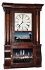Mahogany veneered case in nice condition with a couple of chips on the base, small ding on the left back edge and a repair to the cornice. Original painted dial with some loss at the mounting pins. Hands are replacements. Both tablets are original with some loss on the bottom tablet. Original Brewster and Ingrahams ribbed plate movement. Nice label inside case. Ht 20.5"