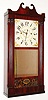 Refinished mahogany veneered case in a very dark finish that somewhat obscures the grain. The top is original though very dark and dirty. Painted dial is very clean with some minor wear. Period hands. Bottom tablet is original with loss. The period mirror in the case needs a wood or cardboard backboard to protect it. Good label inside case. There are no finials. Ht 36"