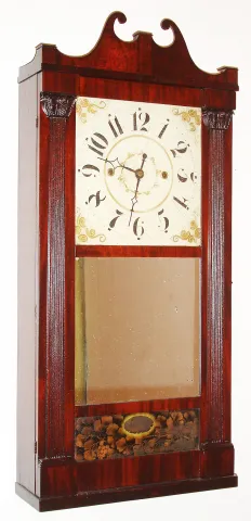 Jeromes and Darrow, Bristol, Conn., 30 hour, time and strike, wood movement reeded pilaster and scroll top shelf clock, c1830 Refinished mahogany veneered case in a very dark finish that somewhat obscures the grain. The top is original though very dark and dirty. Painted dial is very clean with some minor wear. Period hands. Bottom tablet is original with loss. The period mirror in the case needs a wood or cardboard backboard to protect it. Good label inside case. There are no finials. Ht 36"