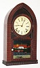 E.N. Welch, late J.C. Brown, Forestville, Conn., 8 day, time and strike ripple molding beehive shelf clock, c1858 Rosewood veneered ripple case in nice condition in original finish. Painted dial has darkened a little over time with some loss at the mounting screws and appears to be original, although the winding holes have been enlarged. Hands are original. Original tablet with some loss and a poor repair to the building in the center. Original bone knob has a hairline crack. Movement is signed. Dark but readable label. Ht 19"
