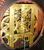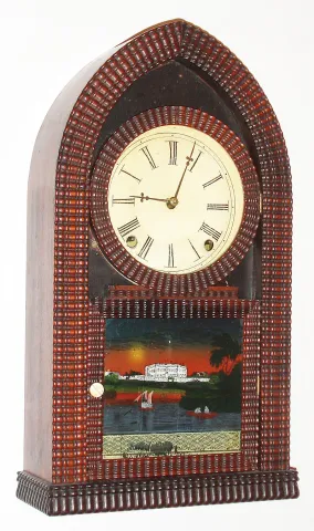 Rosewood veneered ripple case in nice condition in original finish. Painted dial has darkened a little over time with some loss at the mounting screws and appears to be original, although the winding holes have been enlarged. Hands are original. Original tablet with some loss and a poor repair to the building in the center. Original bone knob has a hairline crack. Movement is signed. Dark but readable label. Ht 19"