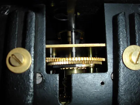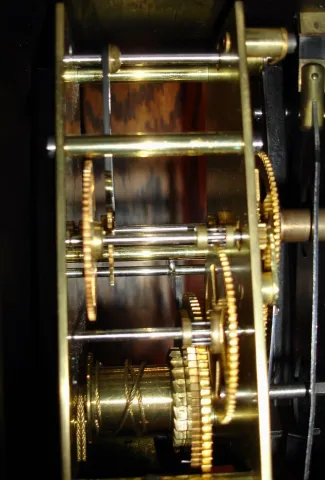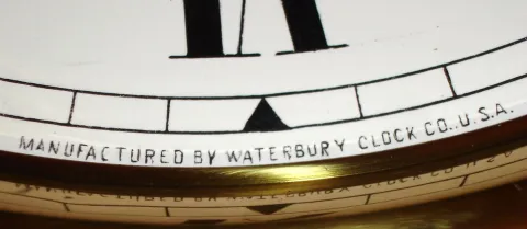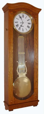 Waterbury Clock Co., Waterbury, Conn., regulator wall clock, 8 day, time only movement with grid iron pendulum now in Standard Electric oak wall case with sweep second's hand movement, c1890