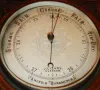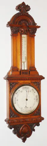 J. Lizars, Glasgow, walnut aneroid barometer and thermometer, c1910 this heavy and beautifully carved instrument has the length and look of an older mercury unit, but the barometer is the later bellows type. The thermometer, indicating two scales, is mercury. Overall condition is very good, with a soft patina on the wood, silvered dials showing just small tarnish areas, and fine beveled glass. Ht 40"