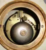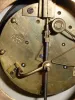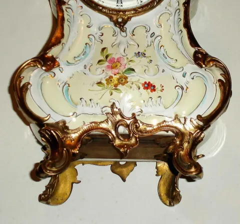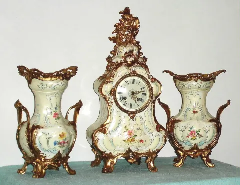 German, Lenzkirch, 3-piece mantel set of porcelain with ormolu adornments, and with quality round movement with porcelain dial and fancy brass hands, the case and side pieces with floral trim, c1875 movement is signed with Lenzkirch logo; is clean and running. No chips nor cracks. Note movement had turned slightly in case at time of photo and glass in back door is absent. Overall excellent original condition. Ht 15"