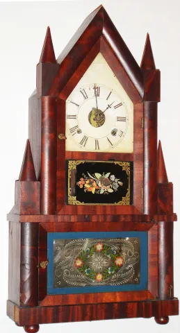 Birge and Fuller, Bristol, Conn., 30 hour, time and strike, wagon spring steeple on frame [or double steeple] shelf clock, c1845 Refinished mahogany veneered case with some loss on the curved molding on the bottom area of the case, a piece missing on the left side and a chip on the bottom door and the flat strip below the top door. Original painted dial has some loss at the mounting pins and at the winding arbors. Bottom tablet is original. Top tablet is different with some loss but appears to be original. Hands are original. One of the chains on the wagon spring has been replaced with brass cable. Dark label inside case. Very few 30 hour wagon springs were produced, with the net result that they tend to bring the same price as an 8-day. Old hands are replacements; should be straight minute hand and small spade hour hand. Ht 24"