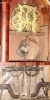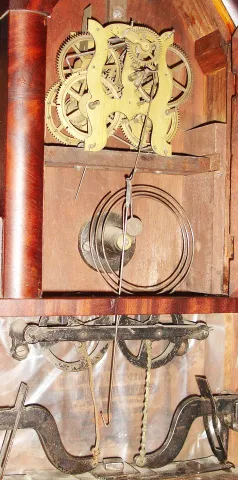 Refinished mahogany veneered case with some loss on the curved molding on the bottom area of the case, a piece missing on the left side and a chip on the bottom door and the flat strip below the top door. Original painted dial has some loss at the mounting pins and at the winding arbors. Bottom tablet is original. Top tablet is different with some loss but appears to be original. Hands are original. One of the chains on the wagon spring has been replaced with brass cable. Dark label inside case. Very few 30 hour wagon springs were produced, with the net result that they tend to bring the same price as an 8-day. Old hands are replacements; should be straight minute hand and small spade hour hand. Ht 24"