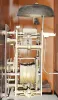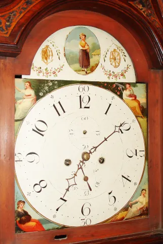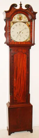 Scottish tall clock, 8 day, time and bell strike, weight driven movement in a mahogany and mahogany veneer case with sting inlay around the door and plinth, reticulated inlay in the broken arch of the hood, reeded columns on hood and reeded half columns on the trunk and painted iron dial depicting seasons in the spandrels, c1830 the case has a great older finish with 40% of reticulated inlay absent from top right ride. The applied bracket base is an older replacement. The movement needs cleaning and service. The dial is in excellent condition with second's hand absent. The top finials and rosettes are a replacement. Ht 87"
