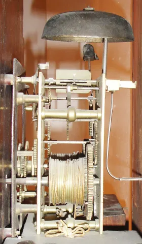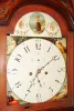Scottish tall clock, 8 day, time and bell strike, weight driven movement in a mahogany and mahogany veneer case with sting inlay around the door and plinth, reticulated inlay in the broken arch of the hood, reeded columns on hood and reeded half columns