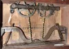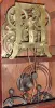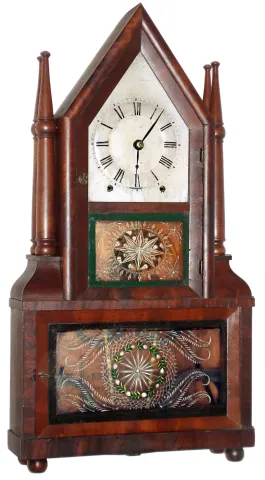 Birge and Fuller, Bristol, Conn., 8 day, time and strike wagon spring steeple on frame with candle finials shelf clock, c1845 Mahogany veneered case in an old finish with some veneer chips on the base corner, just above the bottom door, door knob, and at the back of the top. The candle finials though nice look to be modern replacements. Original painted dial has some wear and loss at the mounting screws and pins. Someone put a coating of what looks like shellac on the dial and left drips and excess shellac to accumulate on the bottom edge. Hour hand looks to original. Minute hand is a replacement. Both glasses are period. Ht 26"
