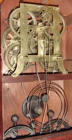 Mahogany veneered case in an old finish with some veneer chips on the base corner, just above the bottom door, door knob, and at the back of the top. The candle finials though nice look to be modern replacements. Original painted dial has some wear and loss at the mounting screws and pins. Someone put a coating of what looks like shellac on the dial and left drips and excess shellac to accumulate on the bottom edge. Hour hand looks to original. Minute hand is a replacement. Both glasses are period. Ht 26"