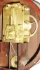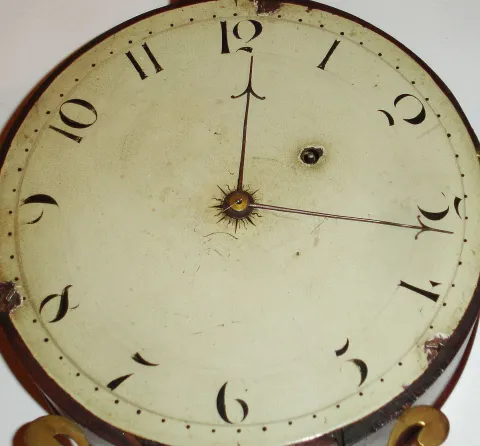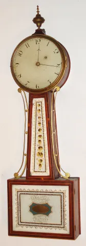 Boston area banjo wall clock, 8 day, time only, weight driven T-bridge movement in a mahogany case with string inlay and reverse painted tablets in throat and lower door and painted metal dial and barb hands, c1805