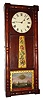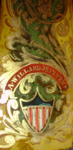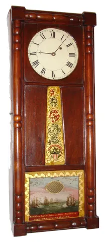 Coffin clock, similar in appearance to a NH mirror clock, 8 day, time only, weight driven movement in the Willard school style with T-bridge suspension in a mahogany case with reverse painted throat and lower tablets signed "A. WILLARD JR. PATENT" and