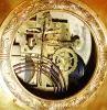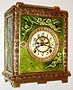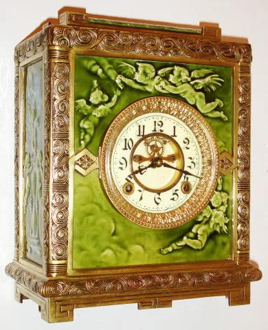 New Haven Clock Co., New Haven, Conn., "No. 1017" model, Asian influenced cast bronze case with green Aesthetic period Chelsea art tiles manufactured by J and G Low, Chelsea, Mass., the tiles depicting clouds, hovering and flying putti, and an hourglass, white enamel Arabic numeral dial, blued steel hands, cast bezel with beveled glass, 8 day, time and strike, movement with Brocot open escapement, c1885 Case very good, tiles without damage, dial with hairlines at 11:00, 1:00, 3:00, 6:00 and 8:00, hands good, bezel and beveled glass good, movement ticks and strikes, an excellent example of a very rare New Haven clock Ht 12 1/4"
